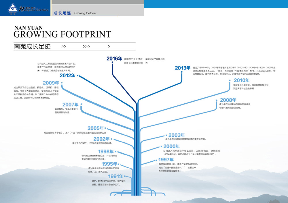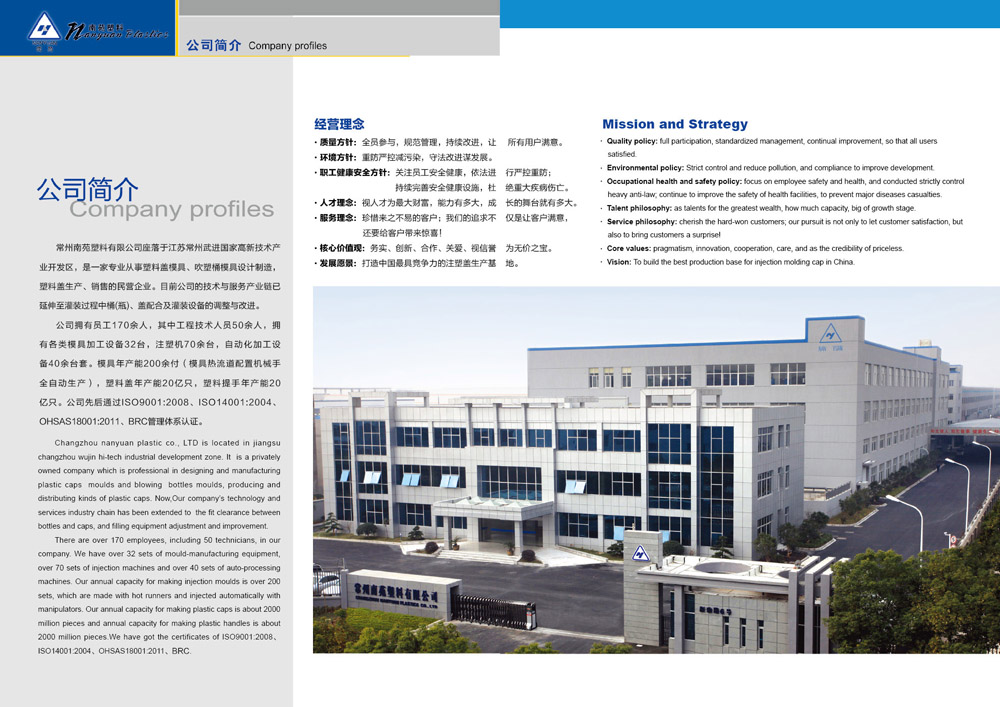 常州南苑塑料有限公司是一家專業(yè)從事塑料蓋模具、吹塑桶模具設計制造及塑料蓋產品生產和銷售的民營企業(yè)。公司創(chuàng)建于1991年,總投資8000萬元,擁有工程技術人員50余人,品質管理人員20余人;各類注塑設備70余臺套。模具加工設備40余臺套,模具年產能200余付,塑料蓋年產能20億只,塑料提手年產能20億只。產品涉及潤滑油、食品和保健品行業(yè)。主要客戶有:中石化、中石油、道達爾、埃爾夫、景田、怡寶、農夫山泉等知名品牌的生產商。