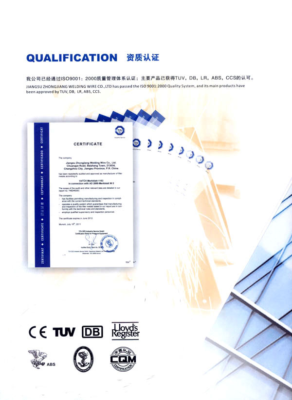 江蘇中江焊絲有限公司成立于1989年,注冊(cè)資金2188萬(wàn)元,是一家專(zhuān)業(yè)從事氣體保護(hù)鍍銅焊絲、鋁焊絲、藥芯焊絲和埋弧焊絲的生產(chǎn)企業(yè)。 經(jīng)過(guò)近20年的不懈努力,目前企業(yè)年生產(chǎn)各類(lèi)焊絲達(dá)50000余噸,產(chǎn)品不僅銷(xiāo)往全國(guó)各省市和地區(qū),還出口到美國(guó)、意大利、英國(guó)、法國(guó)、西班牙、波蘭、捷克、斯洛伐克、立陶宛、斯洛文尼亞、俄羅斯、烏克蘭、希臘、以色列、伊朗、南非、泰國(guó)、印尼、印度、澳大利亞等三十幾個(gè)國(guó)家和地區(qū)。 江蘇中江焊絲有限公司是通過(guò)IS09001:2000質(zhì)量管理體系認(rèn)證的企業(yè),其主要產(chǎn)品已獲得TUV,DB,LR,ABS,CCS的認(rèn)可。企業(yè)奉行“一流的產(chǎn)品,一流的信譽(yù),一流的服務(wù)”的宗旨,竭誠(chéng)為客戶(hù)服務(wù)。