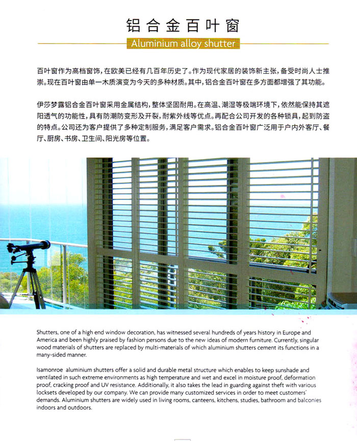 常州伊莎夢(mèng)露百葉窗有限公司成立于2010年,是一家專業(yè)從事高端鋁臺(tái)金百葉窗以及百葉窗五金配件研發(fā)、生產(chǎn)、銷售和服務(wù)的現(xiàn)代化企業(yè)。公司本著“誠(chéng)信為本,客戶至上”的原則。產(chǎn)品遠(yuǎn)銷大洋洲、歐洲、美洲等多個(gè)國(guó)家,并得到客戶的一致認(rèn)可。 目前公司具有比較先進(jìn)的生產(chǎn)設(shè)備及檢測(cè)手段和完善的質(zhì)量保證體系和管理制度,在這基礎(chǔ)上公司每年加大研發(fā)投入,陸續(xù)獲得十多項(xiàng)專利。今后公司還將繼續(xù)堅(jiān)持品牌發(fā)展戰(zhàn)略,提升市場(chǎng)能力,為消費(fèi)者提供更加優(yōu)質(zhì)的產(chǎn)品和服務(wù)。地址:江蘇省常州市經(jīng)濟(jì)開發(fā)區(qū)橫山橋鎮(zhèn)朝陽(yáng)村大橋工業(yè)園509號(hào)電話:0519-88763142 傳真:0519-88762898網(wǎng)址:www.chinaismr.cn郵箱:Isamonroe-liu@outlook.com 48980807@qq.com