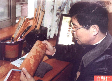白堅(jiān)仁,1956年生于江蘇常州,國家級非物質(zhì)文化遺產(chǎn)、江蘇省級傳承人、江蘇省名人,高級工藝美術(shù)師,是留青竹刻泰斗白士風(fēng)之子。從小深受先父的熏陶和指點(diǎn),寒來署往、夜以繼日,不僅學(xué)到了先父厚樸豁達(dá)的品格,更深得先父竹刻藝術(shù)的真諦。除繼承刻有先父創(chuàng)立的橫臺(tái)屏、筆筒等作品外,更注重作品的創(chuàng)新。多年來,經(jīng)過艱辛的探索和反復(fù)的實(shí)踐,努力吸取姐妹藝術(shù),成功地采用了多片拼裝,配上紅木框架,制成大型的圖文并貌的作品,如帽籠、大插屏、鏡框掛件、四條屏、甚至中堂。在構(gòu)圖內(nèi)容、技法變化、裝幀形式等方面,都走出了創(chuàng)新之路,使所制作品適應(yīng)了現(xiàn)代人們的審美情趣和生活需求,實(shí)現(xiàn)了多年來要使留青竹刻與書畫作品同樣也能懸掛于廳堂之上的愿望。作品多次在國內(nèi)、國際展覽中獲獎(jiǎng),并獲得了留青竹刻史上的首位二項(xiàng)國家專利擁有者。