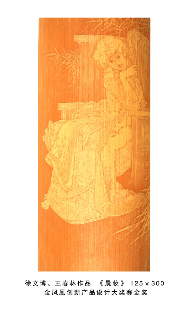 得獎情況 1、扇形擺件《花鳥》2004年9月太湖博覽會金獎 2、《蘭亭序》2008年11月江蘇藝博杯工藝美術(shù)精品獎銀獎 3、《雄風(fēng)圖》2008年11月江蘇藝博杯工藝美術(shù)精品獎創(chuàng)意獎 4、《靜音》2008年11月“天工藝苑•百花杯”中國工藝美術(shù)精品獎銀獎 5、《人物》2008年12月中國收藏藝術(shù)精品博覽會金獎 6、《花鳥》200 8年12月中國收藏藝術(shù)精品博覽會銀獎 7、《青竹鳥語》2008年12月中國收藏藝術(shù)品博覽會“入圍收藏品” 8、《吉祥富貴》2009年3月“金鳳凰”創(chuàng)新產(chǎn)品設(shè)計大獎賽金獎 9、《黃山云!2009年10月江蘇藝博杯工藝美術(shù)精品獎金獎 10、《花鳥》2009年10月第二屆江蘇旅游商品博覽會最佳產(chǎn)品獎 11、《秋菊圖》2009年11月“天工藝苑•百花杯”中國工藝美術(shù)精品獎銀獎 12、《秋鷹圖》2010年3月“金鳳凰”創(chuàng)新產(chǎn)品設(shè)計大獎賽優(yōu)秀獎 13、《花鳥四屏》2010年3月“金鳳凰”創(chuàng)新產(chǎn)品設(shè)計大獎賽銅獎 14、《荷塘清暑》2010年5月深圳國際文化產(chǎn)業(yè)博覽交易會銅獎 15、《溪山煙云圖》2010年9月江蘇藝博杯工藝美術(shù)精品大獎賽金獎 16、《高士臨風(fēng)圖》2010年10月“天工藝苑•百花杯”中國工藝美術(shù)精品獎銀獎 17、《溪山煙云圖》2010年11月第二屆東方工藝美術(shù)之都博覽會“迎春花獎” 18、《深山尋隱圖》2011年3月“金鳳凰”產(chǎn)品設(shè)計大獎賽銅獎 19、《欣欣向榮》2011年5月深圳國際文化產(chǎn)業(yè)博覽交易會金獎 20、《江崖遠(yuǎn)眺圖》2011年9月江蘇藝博杯工藝美術(shù)精品大獎賽金獎 21、《富春山居圖》2011年10月“天工藝苑•百花杯”中國工藝美術(shù)精品獎金獎 22、《深山訪友》2011年11月中國無錫國際文化藝術(shù)博覽會銀獎 23、《幽谷清音》2012年3月“金鳳凰”創(chuàng)新產(chǎn)品設(shè)計大獎賽銅獎 24、《群芳競艷》2012年10月“儒仕儒家、百花杯”中國工藝美術(shù)精品博覽會金獎 25、《山村渡口圖》2012年12江蘇藝博杯工藝美術(shù)精品大獎賽金獎。 26、《晨妝》2013年4月“金鳳凰”創(chuàng)新產(chǎn)品設(shè)計大獎賽金獎。 27、《和風(fēng)圖》2013年6月中國(青島)工藝美術(shù)博覽會創(chuàng)新產(chǎn)品設(shè)計大賽金獎。 28、《松壑聽泉》2013年9月江蘇藝博杯工藝美術(shù)精品大獎賽銀獎。 29、《君子圖》2013年11月“國信•百花杯”中國工藝美術(shù)精品獎銀獎 30《碧水輕舟》2014年5月深圳國際文化產(chǎn)業(yè)博覽交易會銀獎。 31、《千巖萬壑圖》2014年10月“中國原創(chuàng)•百花杯”中國工藝美術(shù)精品獎金獎 32、《溪山訪友圖》2014年10月江蘇藝博杯工藝美術(shù)精品大獎賽銀獎 33、《深山云壑》2014年12月深圳冬季國際文化產(chǎn)業(yè)博覽交易會金獎 34、《鷹》2015年深圳文化產(chǎn)業(yè)博覽交易會獲“中國工藝美術(shù)文化創(chuàng)意獎”金獎