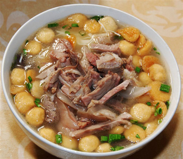 牟利英走進廚房給客人盛羊湯,只見她在漏勺里放入百葉絲和豆炙餅,入鍋燙熟,倒入一只大碗,再倒入一碟羊雜碎,然后舀起一勺篤得奶白的羊骨頭湯,手腕一翻倒入碗里,熱騰騰、香噴噴的一碗羊湯就做好了,此時別忘了往湯里扔一小撮碧綠生青的蒜葉提香。趁熱喝,從嘴里一直熱到胃里,就連整個人似乎也跟著暖熱了起來。談旭東在一邊說,他小時候,羊肉館里用的豆炙餅還是自家熯的(熯,音同“漢”,意為焙或用極少的油煎),現在雖說是別人供貨的,但也算是特制的,要關照多熯一會兒,這樣才不會一下鍋就篤爛,拿回家后,他還要再用油爆香,放在湯里才更好吃。