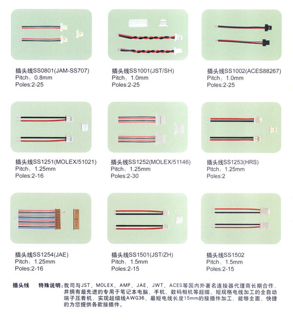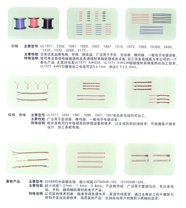 常州市匯創(chuàng)電子有限公司我公司2000年8月成立.端子連接線生產(chǎn)有10余年的經(jīng)驗.結(jié)合韓國連接線生產(chǎn)技術(shù),致力于筆記本電腦,手機,數(shù)碼相機等高端行業(yè)的小間距的端子連接線的研究和生產(chǎn).小間距端子連接線的插頭的常規(guī)型號有 SH/1.0mm, 51021-0200/1.25mm, ZH , PH, EH, XH, SAN, SCN, 2510 等.特殊插頭型號有:02SUR-32S,02SSR-32H.材料用原廠進口的JST, MOLEX,或臺資廠家的(根據(jù)客戶需要).全環(huán)保,無鉛化生產(chǎn).2008年開始導入無鹵素要求。企業(yè)已經(jīng)通過ISO9001-2000質(zhì)量管理體系.質(zhì)量好!交貨快!價格合理!是目前常州AAC等多家大型受話器廠家的優(yōu)秀供應(yīng)商.客戶遍及常州周邊,蘇州,昆山,上海,深圳,嘉興,山東,重慶等地.也有直接出口韓國,臺灣.現(xiàn)有高素質(zhì)員工100人左右.廠房面積2000平方米.