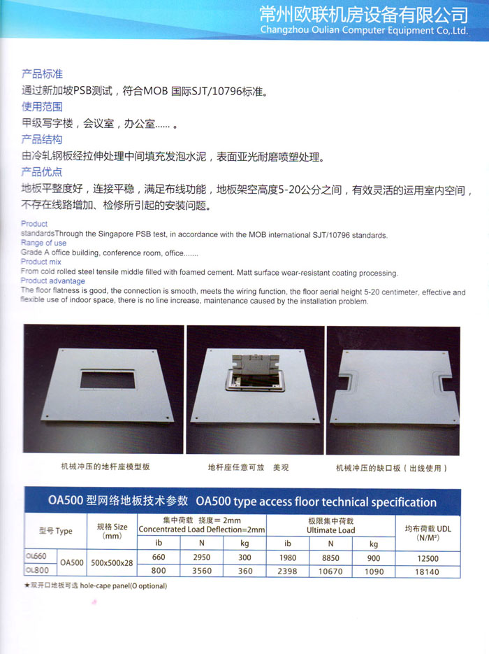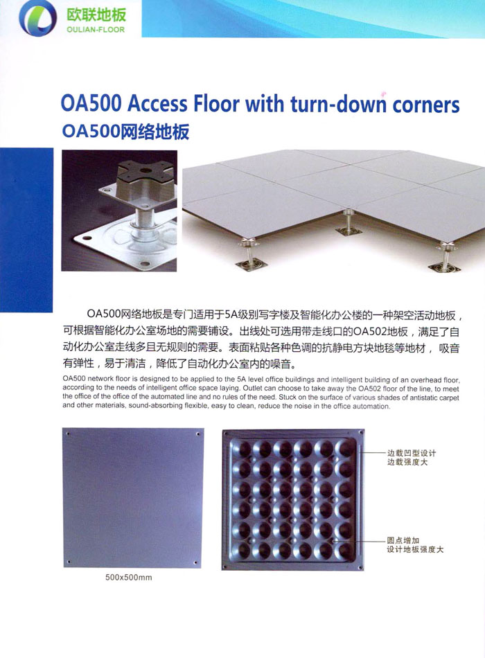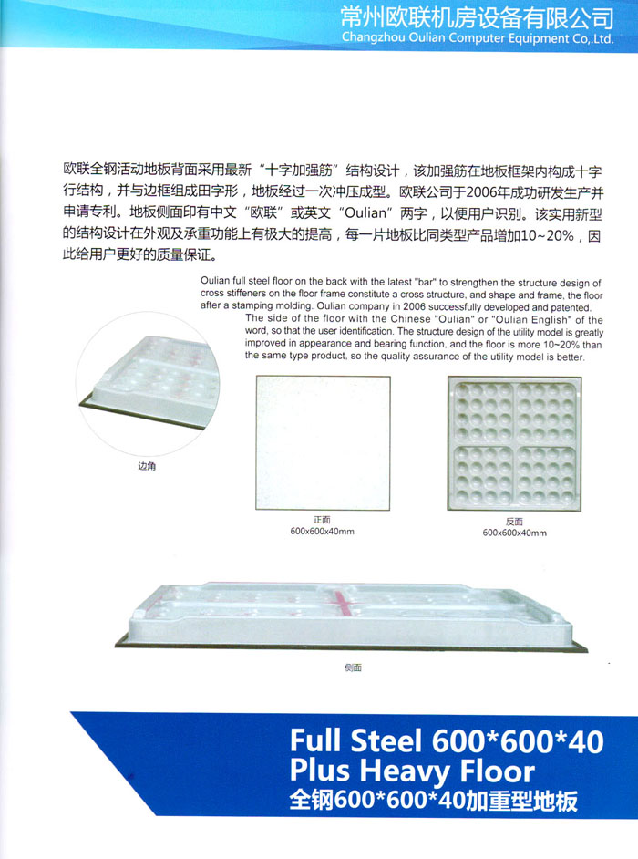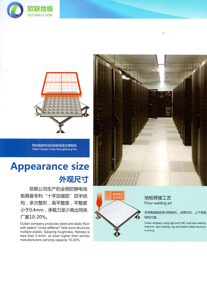 “歐聯(lián)”系列全鋼地板,符合國家安全要求,種類完備多樣,其中防靜電陶瓷地板、硫酸鈣地板等除具有普通瓷質(zhì)的裝飾和實用性外,其耐磨、防水、防火功能優(yōu)于其它同類產(chǎn)品,防靜電系列地板,能切合不同客戶的要求,其靈活的配置,深受客戶歡迎,不同材質(zhì)的地板結(jié)構(gòu)使設(shè)計師的設(shè)計空間比傳統(tǒng)的更加廣闊自由和善變。