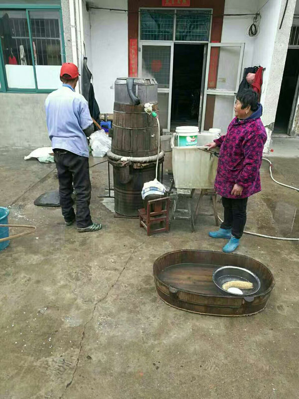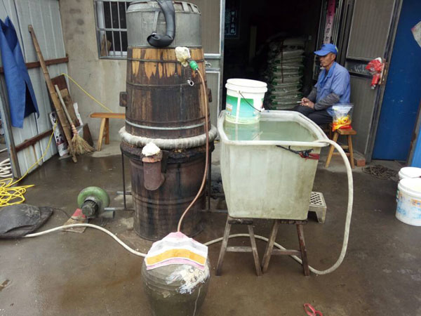 第四步:放入缸中,酒曲和糯米拌好后,便可放入屋內(nèi)的大缸中,并在其中挖出個圓形的洞,放入竹筒做酒窩。在此之前,大缸可用之前冷卻糯米飯的溫水擦一擦暖缸,這樣更有益于酒曲發(fā)酵。為了保證酒曲發(fā)酵的溫度,還要給酒料附上塑料薄膜。若是氣溫低于零度,還得多蓋上幾層棉被才行。像池阿姨家的400斤糯米,老徐至少要重復這些步驟八遍!大缸中的酒料大約發(fā)酵了10天左右,在酒乳已非常豐富之際,按照1:1的比例,打開封口加入冷開水,然后再蓋上棉被。繼續(xù)放置45天后,米酒才算大功告成!如果覺得米酒不過癮,老徐還會將米酒吊成燒酒,也就是白酒,依舊是傳統(tǒng)的老手藝。未來某天,TA會消失 ,其實,做米酒的方法并不難,幾乎是以前家家戶戶的必備技能。然而現(xiàn)如今,不僅老常州們不再自己做酒,就連像老徐這樣的做米酒手藝人也越來越少。就連跟了老徐三十多年的一套米酒家當,也同樣經(jīng)不起歲月:鐵鍋漏了要去找橫山橋的老師傅;木桶壞了要去禮嘉修;爐子也有專門的式樣,過幾年就要拿著圖紙找人翻新......