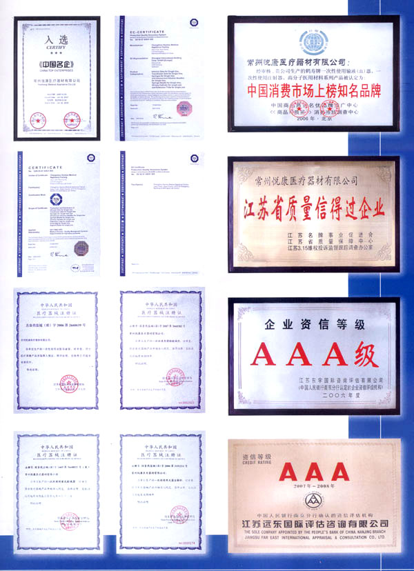 常州悅康醫(yī)療器材有限公司(原常州市鶴壽醫(yī)用器材廠) 是專業(yè)生產(chǎn)一次性使用無菌醫(yī)療器械的股份制企業(yè)。本公司始建于1986年,現(xiàn)公司面積32000平方米,建筑面積為18500平方米。其中十萬級潔凈區(qū)面積為7500平方米,目前擁有固定資產(chǎn)3000余萬元,現(xiàn)有員工380人,主要生產(chǎn)一次性使用輸液(血)器、一次性使用注射器、一次性使用靜脈針、一次性使用注射針及一次性使用高分子醫(yī)療制品,年生產(chǎn)能力超2億套,產(chǎn)品銷售歷年處于供不應(yīng)求的好勢頭,銷售覆蓋全國28個省市、市、自治區(qū)1000多家醫(yī)療單位,受到用戶好評,成為江蘇省生產(chǎn)一次性醫(yī)療用品的重點企業(yè)。 本公司具有自營進(jìn)出口經(jīng)營權(quán),通過ISO9002質(zhì)量管理體系和CE認(rèn)證。我廠將以優(yōu)異的質(zhì)量、合理的價格、及時供貨為各單位提供良好的服務(wù)和方便。