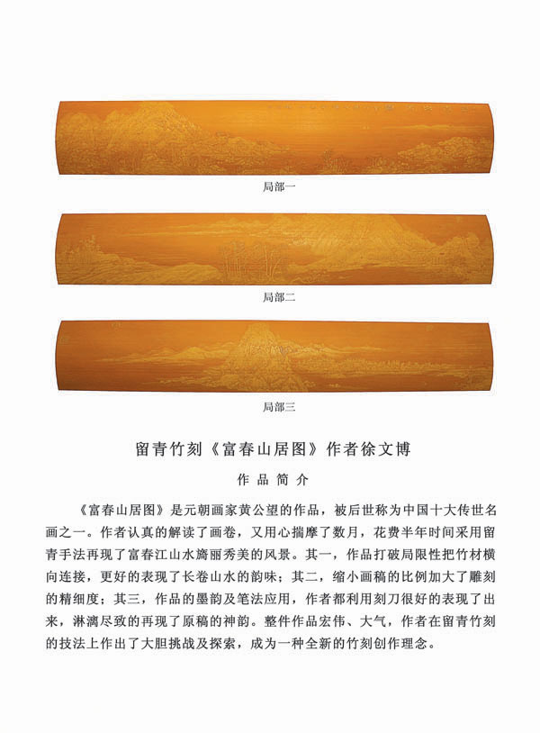 徐博(藝名文博),1973年生,江蘇武進人,江蘇省省名人,高級工藝美術師,常州市留青竹刻非遺傳承人,常州工藝美術家協會理事,被譽為當今中國最具創(chuàng)新意識的新銳竹刻家代表,多次獲得國家工藝美術大獎?釔哿羟嘀窨痰男煳牟┵p竹為樂,以竹詠志,借竹抒懷,悉心探索留青竹刻的藝術表現。在中國工藝美術大師蕭劍波的精心指導下,開創(chuàng)留青水墨山水之技法,更好的體現了竹刻淡雅清秀的藝術風格,并不斷汲取書畫、攝影、雕塑等藝術精華,不斷滋養(yǎng)藝術情趣,提升擴展胸襟人格的同時也逐步形成了其形神兼?zhèn),虛實相生,氣韻生動的藝術特點,作品為眾多的國內外收藏家珍藏。