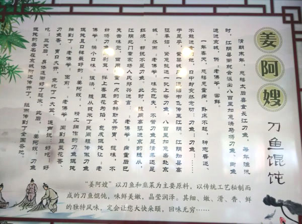 武進(jìn)高新區(qū)姜阿嫂刀魚(yú)餛飩店經(jīng)營(yíng)面積480平方米,可容納150人左右用餐,主要特色刀魚(yú)餛飩,蟹黃大湯包,榮獲“江蘇省鄉(xiāng)村美食節(jié)”金獎(jiǎng)和銀獎(jiǎng)。另外還有特色刀魚(yú)面,刀魚(yú)春卷及蟹肉餛飩,蝦肉餛飩。 本店在經(jīng)營(yíng)過(guò)程中堅(jiān)持以品質(zhì)為主,貨真價(jià)廉,貨品貴面價(jià)不貴,原料“刀魚(yú)”全是現(xiàn)場(chǎng)開(kāi)片去骨。開(kāi)業(yè)至今,深受廣大消費(fèi)者的好評(píng),是常州地區(qū)唯一以刀魚(yú)為特色的餐飲店。