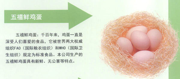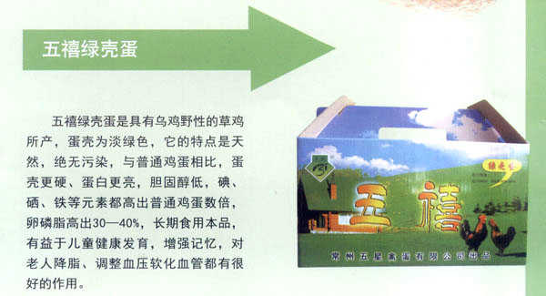 常州五星禽蛋有限公司創(chuàng)建于1990年,是常州市最大的禽蛋生產(chǎn)基地。公司秉承“辦實事、服務城市;上水平,掙創(chuàng)效益”的經(jīng)營宗旨。注重科技開發(fā)與管理創(chuàng)新,全力打造“五禧”品牌。公司于2000年通過了ISO9002質(zhì)量體系認證;2004年又通過了無公害雞蛋產(chǎn)地和產(chǎn)品認證,并獲兩項專利。 經(jīng)多年努力實現(xiàn)了“五禧”產(chǎn)品系列化。現(xiàn)公司每年向市場提供有“五禧”鮮雞蛋,“五禧”土雞蛋,“五禧”ELC蛋,“五禧”綠殼草雞蛋,成為了不同消費群體的理想選擇!拔屐钡岸啻螛s獲常州市場知名商標稱號。