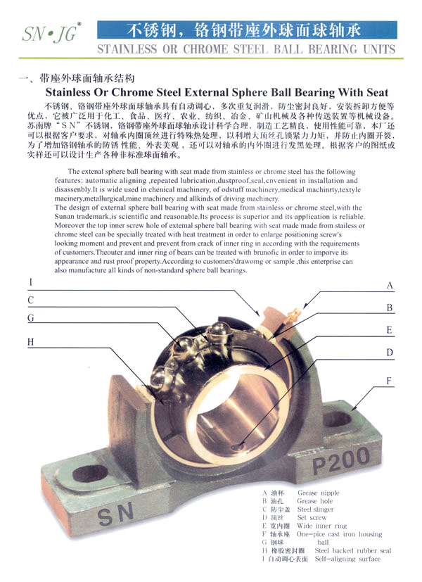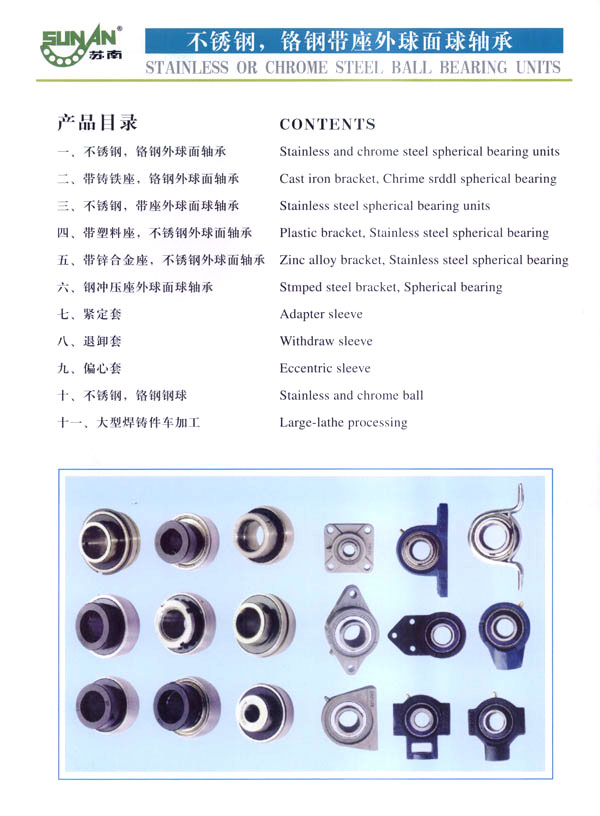 常州市武進蘇南軸承有限公司是生產(chǎn)鋼球及帶座外球面軸承的專業(yè)工廠,主要生產(chǎn)蘇南牌“SN”不銹鋼球、鉻鋼鋼球,以及不銹鋼、鉻鋼UC、UCX、UK、HC、SB、SA、SER、UOOO、KOOO及其它非標系列各類帶座外球面軸承、偏心套、緊定套等產(chǎn)品。本廠生產(chǎn)規(guī)格有軸承鋼球0.5-150m/m,碳鋼球0.5-150m/m,不銹鋼球0.8-50m/m,同時定做各種特殊規(guī)格的不銹鋼球、銅球、陶瓷球等。為廣大用戶提供品質(zhì)優(yōu)良,規(guī)格齊全,價格合理的各種鋼球。 本公司位于常州南部,錫宜高速公路串境而過, 交通便利。南瀕風景秀麗的太湖,沿湖丘陵地帶人文景觀豐富,為常州市武進區(qū)太湖旅游度假區(qū) 。本廠環(huán)境優(yōu)美,具有良好的生產(chǎn)環(huán)境,我們竭誠歡迎國內(nèi)外的朋友進行廣泛多樣的經(jīng)濟合作交往和貿(mào)易合作,并為你提供優(yōu)良的服務。 本公司技術力量雄厚,工藝裝備先進,檢測手段完備,產(chǎn)品質(zhì)量穩(wěn)定,使用性能各項指標都達到國際先進水平,產(chǎn)品主要銷往美國、法國、德國、日本、意大利、澳大利亞、韓國、加拿大、及東南亞等國家和地區(qū)。本公司的“SN”商標鋼球及帶座外球面軸承已贏得國內(nèi)外廣大用戶的信賴。 本公司具有外貿(mào)自營出口權(quán),并于2002年9月通過ISO9001-2000版質(zhì)量體系認證,于2004年8月通過“CQC”產(chǎn)品質(zhì)量認證。