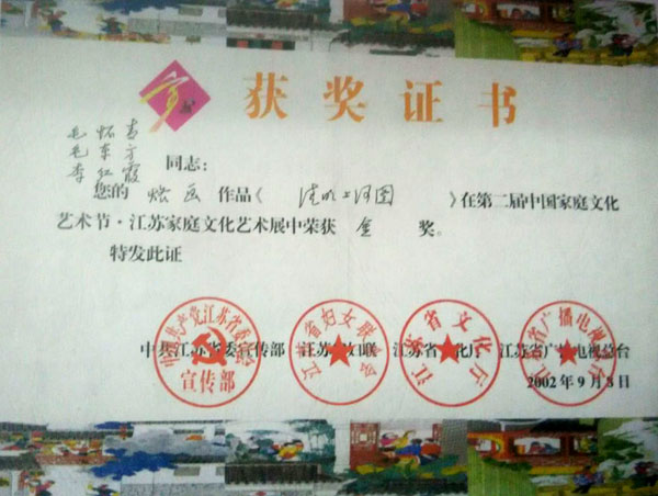 毛懷青,江蘇常州市武進(jìn)人。 中國工藝美術(shù)學(xué)會會員,常州市中國烙畫研究會副會長,常州市文博鑒賞協(xié)會理事,非物質(zhì)文化遺產(chǎn)烙畫傳承人。高級工藝美術(shù)師。 年輕時學(xué)習(xí)國畫、油畫中年蔓現(xiàn)掌州咯畫源遠(yuǎn)流長、歷史悠久,有著其它美術(shù)門類不具備的藝術(shù)風(fēng)格與特色?芍^是工藝美術(shù)中的一朵十分亮麗的藝術(shù)奇葩,是我民族先人給我們留下的一份不可多得十分珍貴的一份文化遺產(chǎn)。為弘揚(yáng)與發(fā)展這份優(yōu)秀文化遺產(chǎn),我從此下定決心研究烙畫,愿付出一份力量為振興烙畫事業(yè)做出貢獻(xiàn)。至今已潛心研究幾十年,取得了可喜的成績,被業(yè)界公認(rèn),社會關(guān)注與認(rèn)可。有“江南烙畫第一筆”之美譽(yù)。 近年來,創(chuàng)作的烙畫作品分別獲得過全國、省市級的金、銀、銅獎多次。中央電視臺曾兩次播放過本人的烙畫作品,江蘇電視臺、常州電視臺也曾多次播放過本人的作品與烙畫藝術(shù)生涯,揚(yáng)子晚報(bào)、常州日報(bào)、常州晚報(bào)也曾多次報(bào)導(dǎo)過本人的烙畫作品,出版物有三種版本都能查閱到介紹本的烙畫從藝生涯與藝術(shù)業(yè)績。