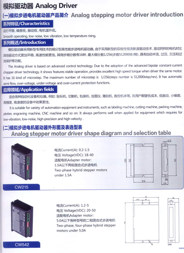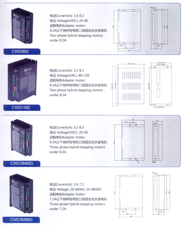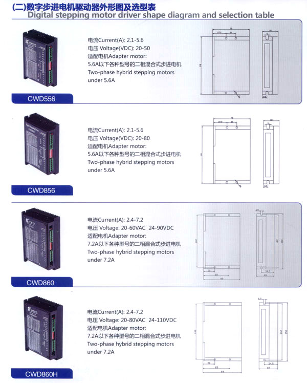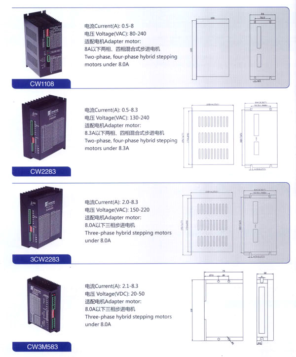 我公司的主要產(chǎn)品有20BH系列、28BH系列、35BH系列、39BH系列、42BH系列、42BHH系列、57BH圓形系列、57BHH方形系列、60BHH方形系列、86BH圓形系列、86BHH方形系列,以及110BHH系列的四相(二相)混合式步進(jìn)電。CW60BL、CW63BL、CW70BL、CW92BL系列無刷電機(jī)也相繼上市。另外步進(jìn)電機(jī)驅(qū)動(dòng)器CW215、CW230、CW5045、CW8060、CW6060AC、CW1108以及全新數(shù)字式驅(qū)動(dòng)器CWD230、CWD556、CWD860H、CW2M2208、CW3M2208和閉環(huán)電機(jī)驅(qū)動(dòng)器CWDS556,CWDS660,CWDS860H,CWDS880L,CWDS1108,CWDS2206等系列也暢銷全球。另外本公司也可對(duì)外承接各種步進(jìn)電機(jī)及相關(guān)工控系統(tǒng)的應(yīng)用系統(tǒng)工程。