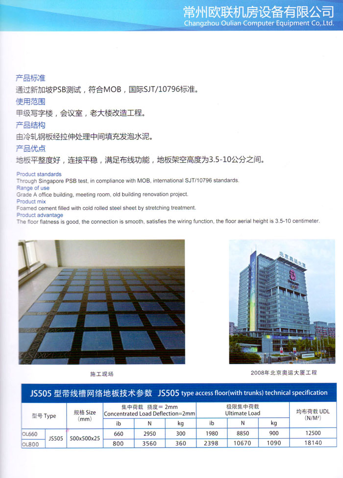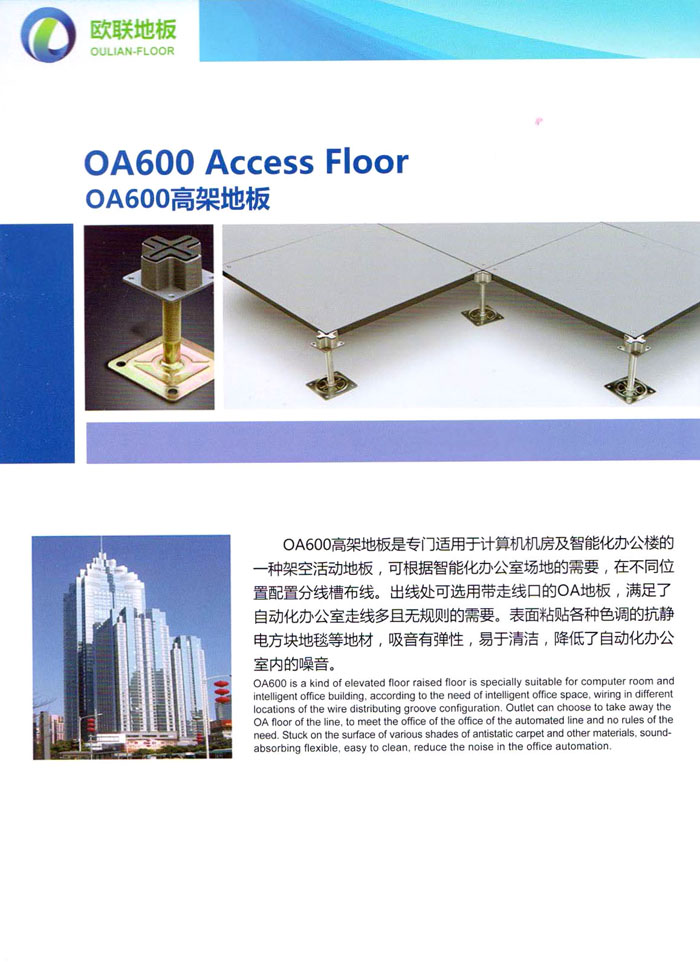 防靜電高架活動(dòng)地板、全鋼地板、陶瓷地板是計(jì)算機(jī)行業(yè)發(fā)展起來(lái)的新型鋪地材料,隔離了潮氣、靜電灰塵,最重要的是解決了綜合布線問(wèn)題,無(wú)需預(yù)埋管線,可隨時(shí)拆卸、搬移,保證了資訊設(shè)備完整的優(yōu)點(diǎn),適應(yīng)了智能化樓宇中信息自動(dòng)化技術(shù)對(duì)所處環(huán)境的特定要求,避免了廣大客戶(hù)的雙重投資,使現(xiàn)代化辦公程度更加高效,辦公場(chǎng)所更加舒適。 “歐聯(lián)”系列全鋼地板,符合國(guó)家安全要求,種類(lèi)完備多樣,其中防靜電陶瓷地板、硫酸鈣地板等除具有普通瓷質(zhì)的裝飾和實(shí)用性外,其耐磨、防水、防火功能優(yōu)于其它同類(lèi)產(chǎn)品,防靜電系列地板,能切合不同客戶(hù)的要求,其靈活的配置,深受客戶(hù)歡迎,不同材質(zhì)的地板結(jié)構(gòu)使設(shè)計(jì)師的設(shè)計(jì)空間比傳統(tǒng)的更加廣闊自由和善變。 公司大力發(fā)展國(guó)內(nèi)外銷(xiāo)售業(yè)務(wù),多次中標(biāo)國(guó)內(nèi)重點(diǎn)工程 ,例:哈爾濱醫(yī)科大學(xué)、山東大學(xué)、上海普通機(jī)場(chǎng)等。 公司將一如既往開(kāi)發(fā)和制造一流的產(chǎn)品,愿與廣大有識(shí)之士合作發(fā)展,共創(chuàng)美好未來(lái)。