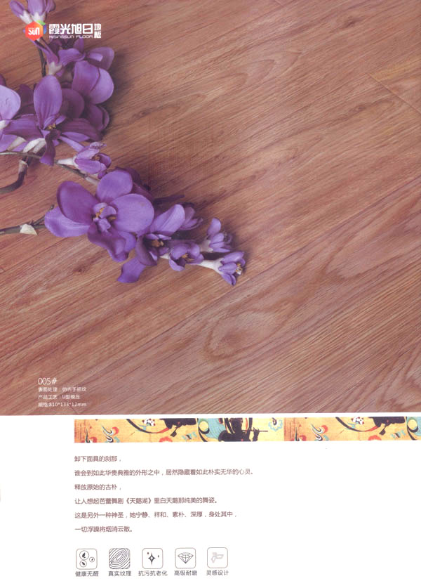 品牌保證,質(zhì)量放心 公司旗下“霞光.旭日”品牌地板系列由旭日皇家、旭日經(jīng)典、旭日戀家、至尊奢華、巧奪天工、水晶陶瓷等幾個(gè)系列構(gòu)成,配有專職質(zhì)量檢驗(yàn)人員,嚴(yán)把產(chǎn)品質(zhì)量關(guān),不斷完善產(chǎn)品質(zhì)量體系、監(jiān)控管理體系。公司對客戶需求全面、科學(xué)、準(zhǔn)確地把握,確保對客戶市場適時(shí)高效反應(yīng)。一流的設(shè)備、精心的選材、完美的工藝以及對產(chǎn)品品味不倦的追求,令奔公司產(chǎn)品獨(dú)樹一幟。