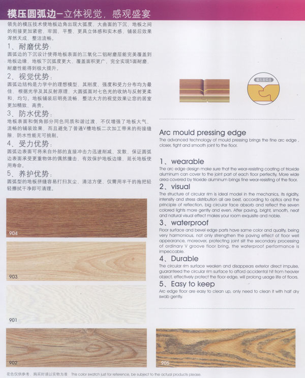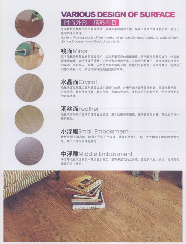 常州漢豐裝飾材料有限公司是一家涉及強(qiáng)化地板制造、屏風(fēng)鋁材生產(chǎn)、進(jìn)出口貿(mào)易的大型公司。2001年公司投入重資.全面引進(jìn)世界頂級(jí)一體化自動(dòng)流水生產(chǎn)線和具有國(guó)際先進(jìn)水準(zhǔn)的德國(guó)權(quán)威木地板生產(chǎn)技術(shù),興建強(qiáng)化地板生產(chǎn)基地。多年以來(lái).一直不斷加強(qiáng)生產(chǎn)設(shè)備、廠房基礎(chǔ)投入,目前公司年生產(chǎn)強(qiáng)化地板能力已經(jīng)達(dá)到了500萬(wàn)平方米,步入國(guó)內(nèi)一流行列,具備了雄厚的國(guó)際競(jìng)爭(zhēng)力。 漢豐地板以奉獻(xiàn)生活中最完美的地板為發(fā)展目標(biāo),時(shí)尚流行的設(shè)計(jì)風(fēng)格和多樣化的產(chǎn)品類型,贏得了市場(chǎng)的廣泛贊譽(yù)和肯定。產(chǎn)品嚴(yán)格按照歐洲標(biāo)準(zhǔn)檢測(cè)強(qiáng)化木地板的各項(xiàng)性能指標(biāo).達(dá)到百分百的國(guó)際技術(shù)標(biāo)準(zhǔn),確保了每一塊地板都有著上乘品質(zhì),是綠色環(huán)保的好地板。并先后通過了Isc)9001國(guó)際質(zhì)量管理體系認(rèn)證,IS014001國(guó)際環(huán)境管理體系認(rèn)證.中國(guó)環(huán)境標(biāo)志產(chǎn)品認(rèn)證,深得用戶的一致好評(píng),是寫字樓、商場(chǎng)、大型超市、學(xué)校、建筑樓宇、娛樂場(chǎng)所、家用私宅等鋪裝的首選地板。