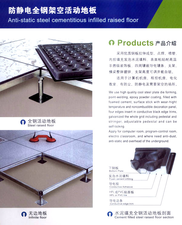 常州天馳活動地板有限公司始創(chuàng)于2010年,原身是常州市武進區(qū)橫林天馳機房地板廠,地處橫林工業(yè)園區(qū),交通便捷。 公司主要生產(chǎn)和銷售各種機房地板,自創(chuàng)立以來,以品質(zhì)第一,信譽第一,服務(wù)第一的理念堅持做全國最優(yōu)質(zhì)量。 防靜電高架活動地板是計算機行業(yè)發(fā)展起來的新型鋪地材料,隔離了潮氣,靜電灰塵。最重要的是解決了綜合布線問題,無需預(yù)埋管線,可隨時拆卸,搬移,保證了資訊設(shè)備完整的優(yōu)點,適應(yīng)了智能化樓宇中信息自動化技術(shù)對所處環(huán)境的特定要求,避免了廣大客戶的雙重投資,使現(xiàn)代化辦公程度更加高效,辦公場所更加舒適。 公司專業(yè)生產(chǎn)“天馳”系列活動地板,符合國家安全要求,種類完備多樣,其中防靜電瓷質(zhì)高架通路地板除具有普通瓷質(zhì)的裝飾和實用性外,其耐磨,防水,防火功能優(yōu)于其他同類產(chǎn)品,深受客戶歡迎。 公司大力發(fā)展國內(nèi)外銷售業(yè)務(wù),多次中標國內(nèi)重點裝飾工程,例:湖南電視臺,寧波縣變電站,鞍山市120急救指揮中心等。 公司將一如既往開發(fā)和制造一流的產(chǎn)品,愿與廣大有識之士合作發(fā)展,共創(chuàng)美好未來!