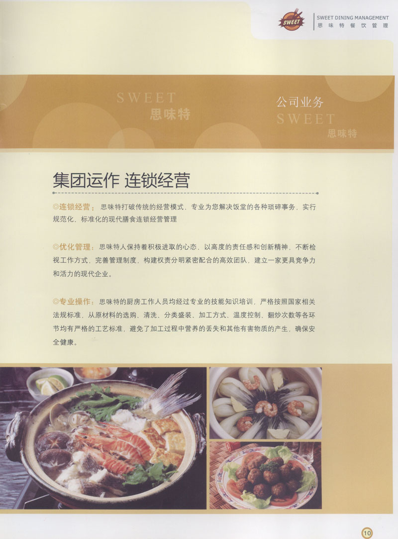 常州市思味特餐飲有限公司是一家專(zhuān)業(yè)從事企事業(yè)后勤服務(wù)的有限責(zé)任公司,公司從承包食堂起步,逐漸發(fā)展為經(jīng)營(yíng)團(tuán)膳承包、營(yíng)養(yǎng)送餐、生活區(qū)管理、連鎖餐廳的綜合型企業(yè)。2008年公司斥資100萬(wàn)元,在常州興建了可以同時(shí)提供3000餐膳食的中央廚房,重點(diǎn)打造“和美客”后勤服務(wù)品牌,全力為企事業(yè)單位解決后勤后顧之憂(yōu)。 到目前為止,我們合作成功的企事業(yè)單位超過(guò)50多家,服務(wù)人數(shù)突破15萬(wàn),合作單位包括國(guó)家機(jī)關(guān)、國(guó)有企業(yè)、三資企業(yè)、民營(yíng)企業(yè)、學(xué)校、醫(yī)院等,其中不乏國(guó)際知名品牌公司。 和美客愿為更多的國(guó)內(nèi)外企事業(yè)單位及機(jī)關(guān)團(tuán)體分憂(yōu)解難,從廚房設(shè)計(jì)、菜品配送、團(tuán)膳承包、到生活區(qū)管理等提供全方位的服務(wù)。