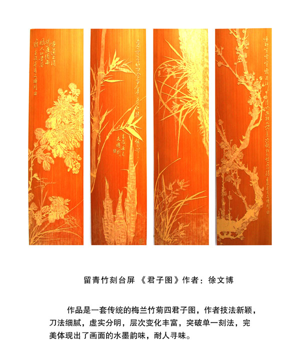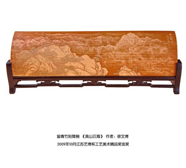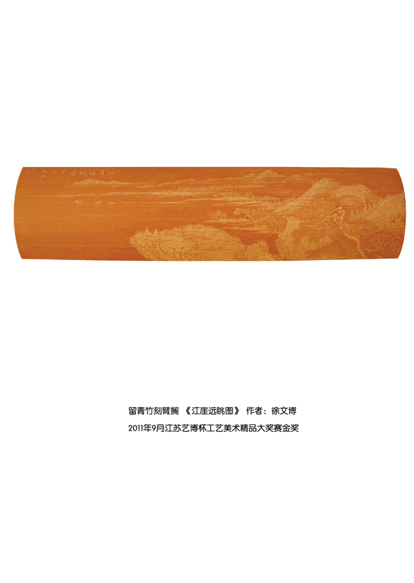 徐博(藝名文博),1973年生,江蘇武進人,江蘇省省名人,高級工藝美術師,常州市留青竹刻非遺傳承人,常州工藝美術家協(xié)會理事,被譽為當今中國最具創(chuàng)新意識的新銳竹刻家代表,多次獲得國家工藝美術大獎。酷愛留青竹刻的徐文博賞竹為樂,以竹詠志,借竹抒懷,悉心探索留青竹刻的藝術表現(xiàn)。在中國工藝美術大師蕭劍波的精心指導下,開創(chuàng)留青水墨山水之技法,更好的體現(xiàn)了竹刻淡雅清秀的藝術風格,并不斷汲取書畫、攝影、雕塑等藝術精華,不斷滋養(yǎng)藝術情趣,提升擴展胸襟人格的同時也逐步形成了其形神兼?zhèn),虛實相生,氣韻生動的藝術特點,作品為眾多的國內(nèi)外收藏家珍藏。