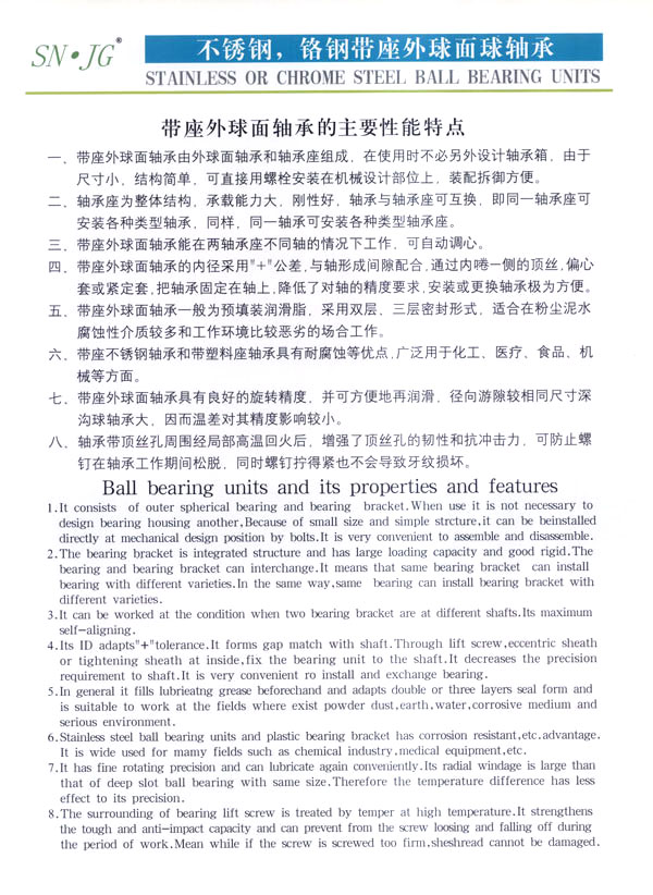 常州市武進(jìn)蘇南軸承有限公司是生產(chǎn)鋼球及帶座外球面軸承的專(zhuān)業(yè)工廠(chǎng),主要生產(chǎn)蘇南牌“SN”不銹鋼球、鉻鋼鋼球,以及不銹鋼、鉻鋼UC、UCX、UK、HC、SB、SA、SER、UOOO、KOOO及其它非標(biāo)系列各類(lèi)帶座外球面軸承、偏心套、緊定套等產(chǎn)品。本廠(chǎng)生產(chǎn)規(guī)格有軸承鋼球0.5-150m/m,碳鋼球0.5-150m/m,不銹鋼球0.8-50m/m,同時(shí)定做各種特殊規(guī)格的不銹鋼球、銅球、陶瓷球等。為廣大用戶(hù)提供品質(zhì)優(yōu)良,規(guī)格齊全,價(jià)格合理的各種鋼球。 本公司位于常州南部,錫宜高速公路串境而過(guò), 交通便利。南瀕風(fēng)景秀麗的太湖,沿湖丘陵地帶人文景觀(guān)豐富,為常州市武進(jìn)區(qū)太湖旅游度假區(qū) 。本廠(chǎng)環(huán)境優(yōu)美,具有良好的生產(chǎn)環(huán)境,我們竭誠(chéng)歡迎國(guó)內(nèi)外的朋友進(jìn)行廣泛多樣的經(jīng)濟(jì)合作交往和貿(mào)易合作,并為你提供優(yōu)良的服務(wù)。 本公司技術(shù)力量雄厚,工藝裝備先進(jìn),檢測(cè)手段完備,產(chǎn)品質(zhì)量穩(wěn)定,使用性能各項(xiàng)指標(biāo)都達(dá)到國(guó)際先進(jìn)水平,產(chǎn)品主要銷(xiāo)往美國(guó)、法國(guó)、德國(guó)、日本、意大利、澳大利亞、韓國(guó)、加拿大、及東南亞等國(guó)家和地區(qū)。本公司的“SN”商標(biāo)鋼球及帶座外球面軸承已贏得國(guó)內(nèi)外廣大用戶(hù)的信賴(lài)。 本公司具有外貿(mào)自營(yíng)出口權(quán),并于2002年9月通過(guò)ISO9001-2000版質(zhì)量體系認(rèn)證,于2004年8月通過(guò)“CQC”產(chǎn)品質(zhì)量認(rèn)證。