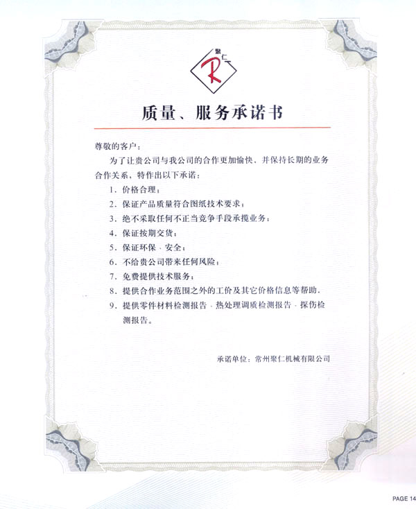 聚仁重效率更重質(zhì)量;在聚仁,寧缺毋濫的精品意識(shí)是每個(gè)員工的責(zé)任,制造精良產(chǎn)品是每個(gè)員工永遠(yuǎn)的追求。聚仁立求做到要效率,更要質(zhì)量,除了品質(zhì)一流的產(chǎn)品外,其它產(chǎn)品絕不交付客戶(hù)。聚仁重現(xiàn)場(chǎng)更重市場(chǎng):市場(chǎng)決定現(xiàn)場(chǎng),現(xiàn)場(chǎng)連著市場(chǎng),現(xiàn)場(chǎng)為市場(chǎng)服務(wù),在搞好現(xiàn)場(chǎng)管理的同時(shí),實(shí)現(xiàn)與市場(chǎng)和客戶(hù)的雙贏。聚仁對(duì)客戶(hù)的承諾是:不合格的材料不進(jìn)廠,不合格的半成品不轉(zhuǎn)序,不合格的產(chǎn)品不交付,以百分之百的合格品交付客戶(hù)。