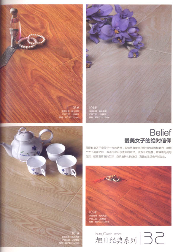 品牌保證,質(zhì)量放心 公司旗下“霞光.旭日”品牌地板系列由旭日皇家、旭日經(jīng)典、旭日戀家、至尊奢華、巧奪天工、水晶陶瓷等幾個系列構(gòu)成,配有專職質(zhì)量檢驗人員,嚴(yán)把產(chǎn)品質(zhì)量關(guān),不斷完善產(chǎn)品質(zhì)量體系、監(jiān)控管理體系。公司對客戶需求全面、科學(xué)、準(zhǔn)確地把握,確保對客戶市場適時高效反應(yīng)。一流的設(shè)備、精心的選材、完美的工藝以及對產(chǎn)品品味不倦的追求,令奔公司產(chǎn)品獨樹一幟。