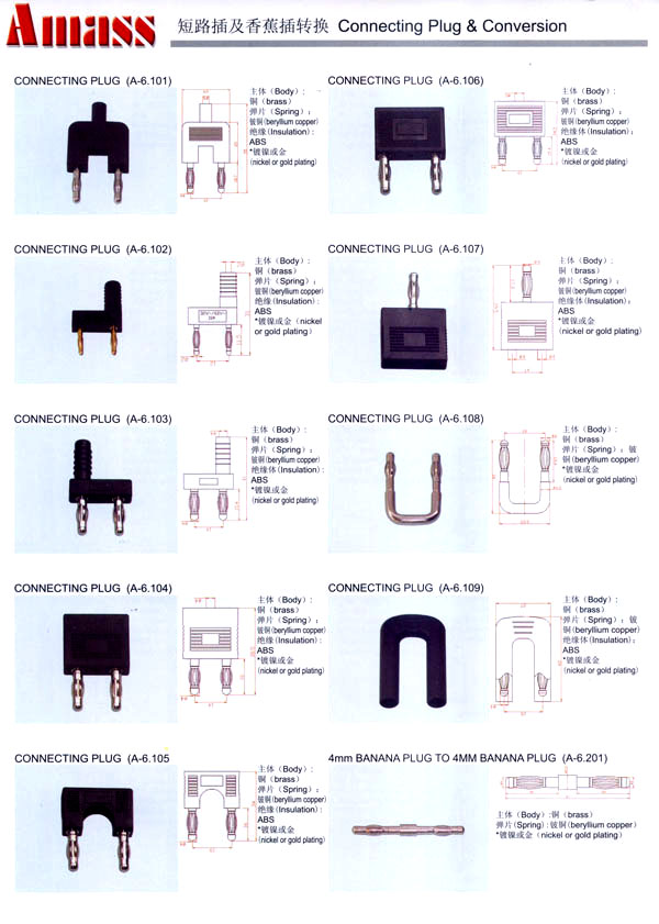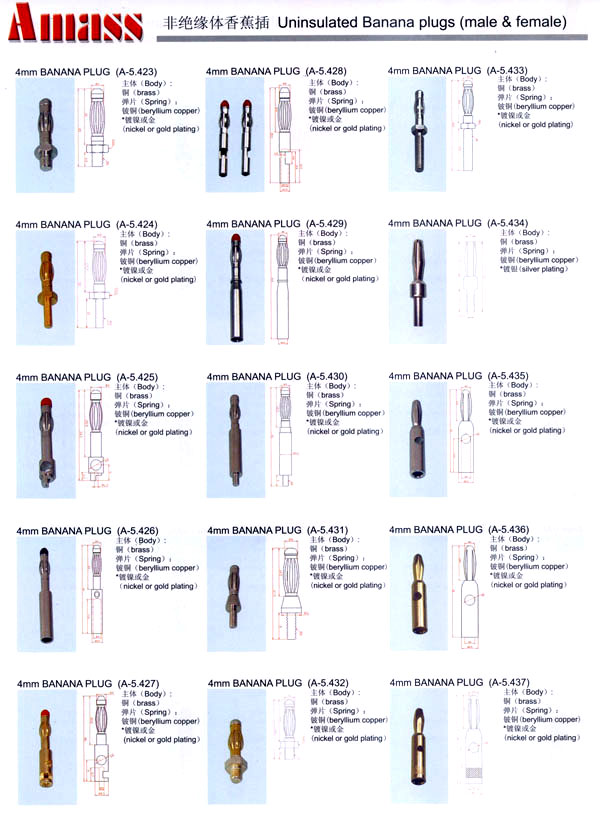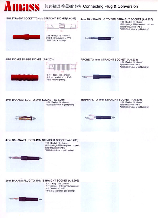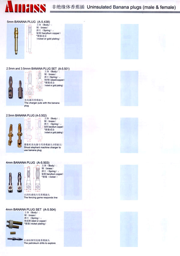 本公司專業(yè)生產(chǎn)各類香蕉插頭,香蕉插座,接線柱,電瓶夾,鱷魚夾,測(cè)試導(dǎo)線,測(cè)試筆等。產(chǎn)品分2mm/2.5mm/3mm/3.5mm/4mm五大系列,百余種款式, 各種香蕉插廣泛用于儀器、儀表、電力測(cè)試、教學(xué)、玩具,視聽設(shè)備、醫(yī)療儀器,保健產(chǎn)品等領(lǐng)域。公司技術(shù)力量雄厚,生產(chǎn)工藝先進(jìn),產(chǎn)品遠(yuǎn)銷港、臺(tái)、歐美,并與飛利浦等國(guó)際品牌配套。公司本著精益求精的理念,歡迎新老客戶光臨。 我們擁有資深的工程師和豐富的電子產(chǎn)品銷售經(jīng)驗(yàn),專業(yè)生產(chǎn)各類電子接插件產(chǎn)品。 香蕉插頭,香蕉插座,電瓶夾,鱷魚夾等品種齊全、 質(zhì)量可靠,致力服務(wù)于通訊、數(shù)據(jù)通信、消費(fèi)類電子產(chǎn)品、計(jì)算機(jī)和計(jì)算機(jī)外圍設(shè)備以及工業(yè)應(yīng)用等領(lǐng)域,能給客戶提供全面采購解決方案。 我們秉承穩(wěn)健作風(fēng)、誠(chéng)實(shí)經(jīng)營(yíng)、合理價(jià)格、完善服務(wù)的宗旨,在全體客戶的支持下,公司不斷創(chuàng)新進(jìn)取,業(yè)績(jī)蒸蒸日上,已與數(shù)十家電子零件制造商及其分支機(jī)構(gòu)建立密切合作關(guān)系,在國(guó)內(nèi)擁有數(shù)百家固定客戶。