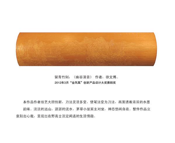 徐博(藝名文博),1973年生,江蘇武進(jìn)人,江蘇省省名人,高級(jí)工藝美術(shù)師,常州市留青竹刻非遺傳承人,常州工藝美術(shù)家協(xié)會(huì)理事,被譽(yù)為當(dāng)今中國(guó)最具創(chuàng)新意識(shí)的新銳竹刻家代表,多次獲得國(guó)家工藝美術(shù)大獎(jiǎng)?釔(ài)留青竹刻的徐文博賞竹為樂(lè),以竹詠志,借竹抒懷,悉心探索留青竹刻的藝術(shù)表現(xiàn)。在中國(guó)工藝美術(shù)大師蕭劍波的精心指導(dǎo)下,開(kāi)創(chuàng)留青水墨山水之技法,更好的體現(xiàn)了竹刻淡雅清秀的藝術(shù)風(fēng)格,并不斷汲取書(shū)畫(huà)、攝影、雕塑等藝術(shù)精華,不斷滋養(yǎng)藝術(shù)情趣,提升擴(kuò)展胸襟人格的同時(shí)也逐步形成了其形神兼?zhèn)洌搶?shí)相生,氣韻生動(dòng)的藝術(shù)特點(diǎn),作品為眾多的國(guó)內(nèi)外收藏家珍藏。