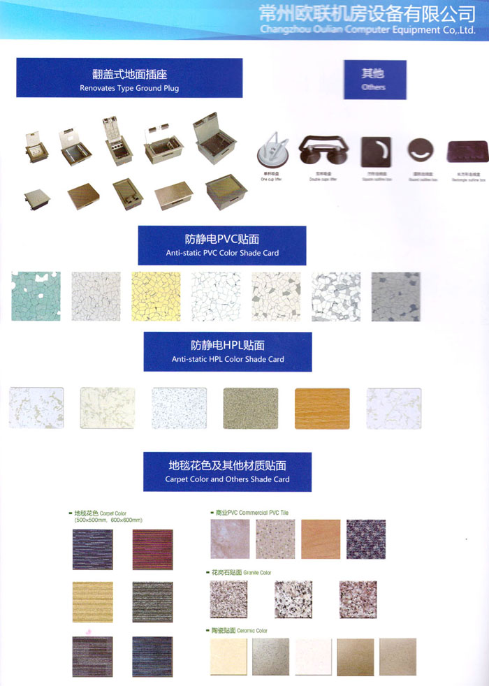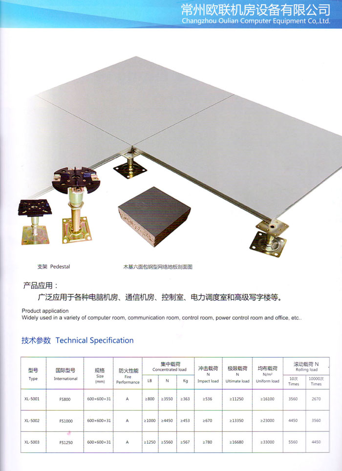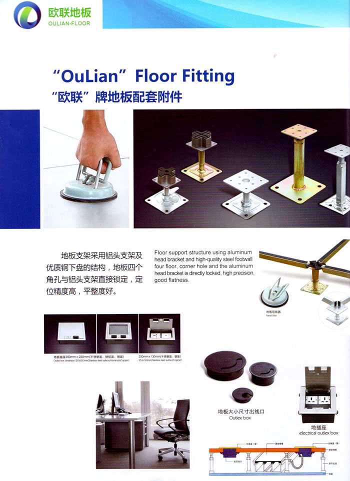 防靜電高架活動地板、全鋼地板、陶瓷地板是計算機行業(yè)發(fā)展起來的新型鋪地材料,隔離了潮氣、靜電灰塵,最重要的是解決了綜合布線問題,無需預(yù)埋管線,可隨時拆卸、搬移,保證了資訊設(shè)備完整的優(yōu)點,適應(yīng)了智能化樓宇中信息自動化技術(shù)對所處環(huán)境的特定要求,避免了廣大客戶的雙重投資,使現(xiàn)代化辦公程度更加高效,辦公場所更加舒適。 “歐聯(lián)”系列全鋼地板,符合國家安全要求,種類完備多樣,其中防靜電陶瓷地板、硫酸鈣地板等除具有普通瓷質(zhì)的裝飾和實用性外,其耐磨、防水、防火功能優(yōu)于其它同類產(chǎn)品,防靜電系列地板,能切合不同客戶的要求,其靈活的配置,深受客戶歡迎,不同材質(zhì)的地板結(jié)構(gòu)使設(shè)計師的設(shè)計空間比傳統(tǒng)的更加廣闊自由和善變。 公司大力發(fā)展國內(nèi)外銷售業(yè)務(wù),多次中標(biāo)國內(nèi)重點工程 ,例:哈爾濱醫(yī)科大學(xué)、山東大學(xué)、上海普通機場等。 公司將一如既往開發(fā)和制造一流的產(chǎn)品,愿與廣大有識之士合作發(fā)展,共創(chuàng)美好未來。