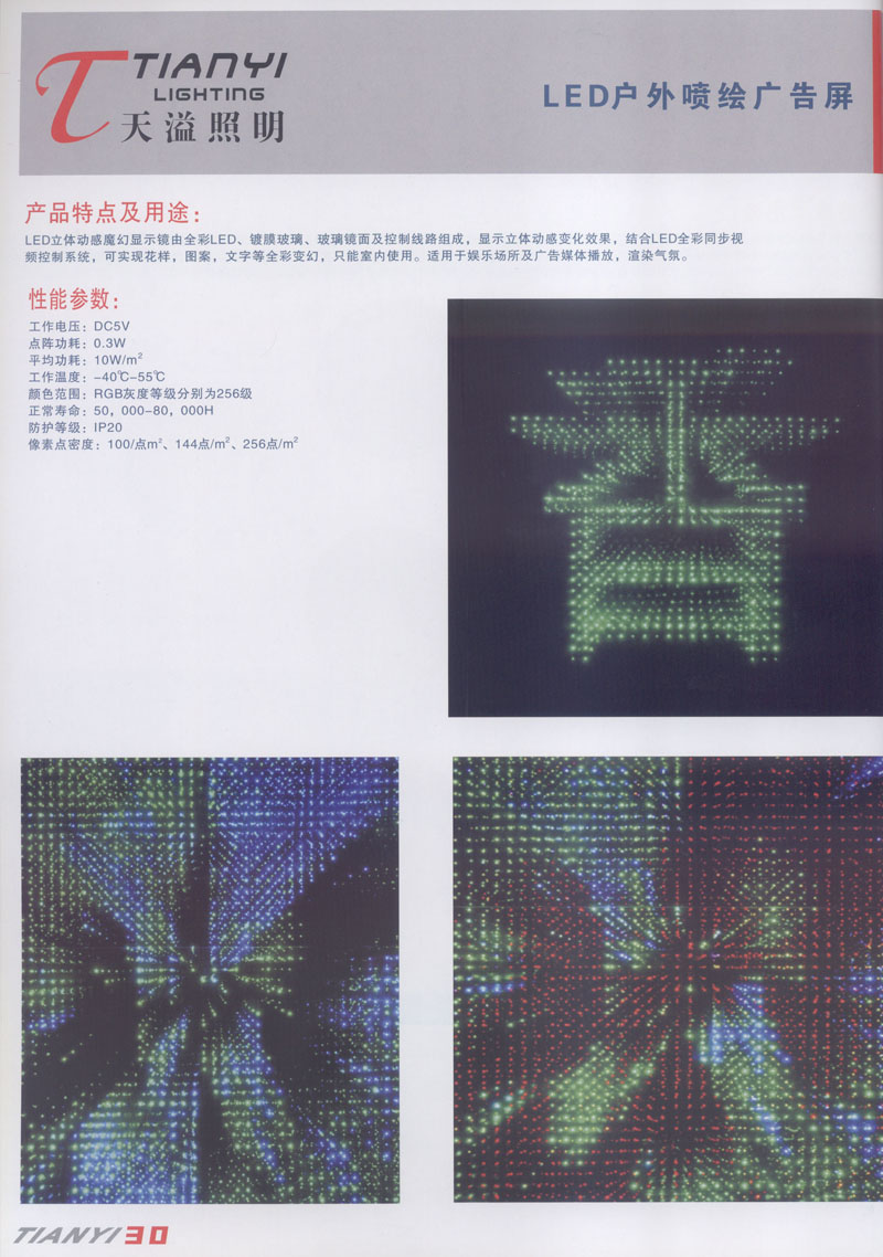 天溢照明是中國領(lǐng)先的專業(yè)從事LED廣告照明裝飾燈具設(shè)計、系統(tǒng)開發(fā)、燈具制造、工程服務(wù)一體的專業(yè)型公司,本公司產(chǎn)品已廣泛應(yīng)用于全國大多數(shù)城市夜景亮化景觀照明、酒店休閑娛樂夜場夢幻燈光、戶內(nèi)外廣告宣傳、建筑及室內(nèi)照明以及家居裝飾等場合。