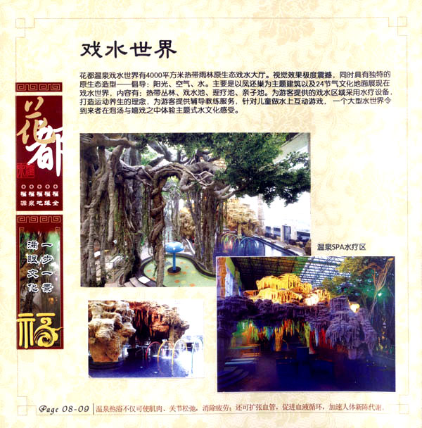 淹城花都溫泉水城孕育天地之精華,悅身、悅?cè)、悅心、悅神。置身其中泉水潺潺,霧氣繚繞、花瓣飄香,恍若仙境!稗渌略谑,弄花香滿衣”,花都溫泉的浪漫與溫潤在這里完美展現(xiàn)。 花都溫泉水城包括洗浴區(qū)、戲水世界、露天溫泉、自助餐廳、生態(tài)房、別墅區(qū)、紅文化房、VIP區(qū)等多種功能區(qū)域,是集溫泉養(yǎng)生、休閑住宿、演藝會務(wù)為—體的休閑度假勝地,給賓客帶來江南小鎮(zhèn)的浪漫水城之旅。 古木新枝畔賓客對酒當(dāng)歌,溪泉石椅旁把茶品啜。 淹城-三勤生態(tài)酒店,這里是一處綠色生態(tài)的美食家園。此地鬼斧神工.奇水異石,和風(fēng)細(xì)雨林中穿過,引百鳥朝來暮歌;這里集生態(tài)餐飲、演藝、中小型會務(wù)為一體,將現(xiàn)代裝飾風(fēng)格和古雅拙樸的自然裝修完美整合;這里聚集大江南北名廚,推出精致綠色美昧佳肴。來到這里,賓客可享田園至美之景,品舌尖至鮮之味,實(shí)乃人生一大樂事。